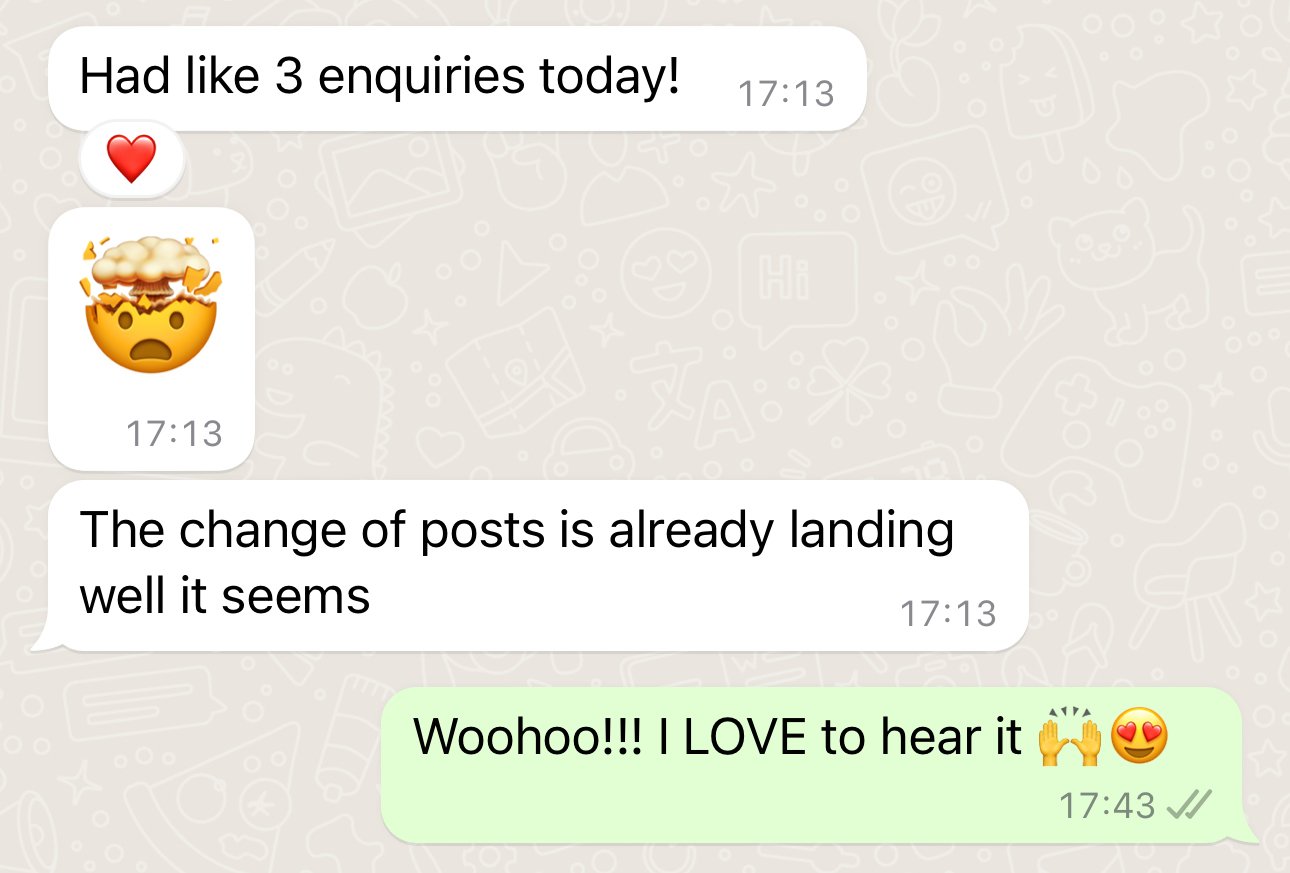 My unlimited support and accountability on weekdays via WhatsApp. Plus access to my little black book of experts.
