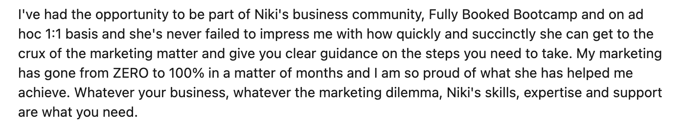 As a result of working together, I launched my first ever one-to-many mentoring programme - and had my first four-figure launch. That was such a huge milestone for me. And now, with Niki’s continued support, I’m fleshing out plans for round two, aiming for just under a five-figure launch. I’m walking into it with more clarity, strategy and belief than ever before.
